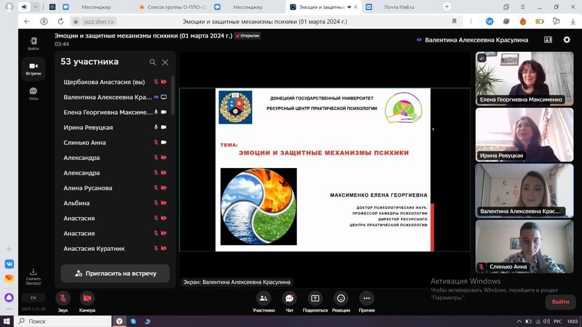 Тема встречи – «Эмоции и защитные механизмы психики» для студентов и школьников психолого-педагогических классов ДНР.