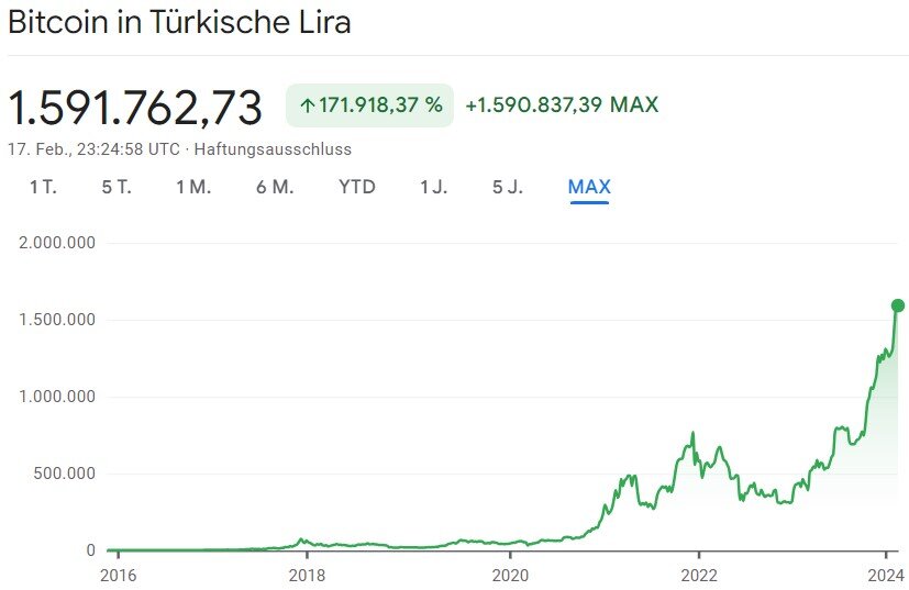 Текущий рост курса BTC привел к тому, что биткоин достиг нового максимума в национальной валюте Турции, турецкой лире (TRY). Предыдущий максимум 2021 года в почти 852 500 турецких лир за BTC был превышен, и уже в середине февраля актив торговался по цене более 1 591 000 турецких лир. Это хорошо видно на графике ниже: