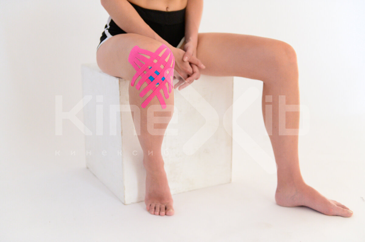Что же делать, если появились ушибы и гематомы? Как помочь быстрее восстановиться своему телу и избавиться от болевых ощущений? На помощь как всегда приходит тейпирование. Данная лимфодреннажная аппликация применяется от ушибов и гематом и ускоряет процесс восстановления. Наклеиваться может практически на любое место с учетом следующих нюансов: На данном примере показана аппликация от ушиба на колене, который мы условно обозначили синим кружком. Шаг 1. Для растяжения мышцы бедра, человек в положении сидя сгибает ногу в колене или кладет ее под ягодицу Шаг 2. Тейп отмеряется таким образом, чтобы его длинна полностью покрывала зону гематомы. Придаем ленте «веерообразную» форму, надрезав ее с одной стороны на 4 части, как показано на фото. Для аппликации понадобится 2 одинаковых отрезка. Закругляем края, обезжириваем кожу. Кстати, чтобы не тратить время на нарезку тейпов, можно сразу приобрести кинезиотейп Kinexib ULTRA в виде "осьминожек". Это набор, состоящий из 8 осьминожек. Он создан