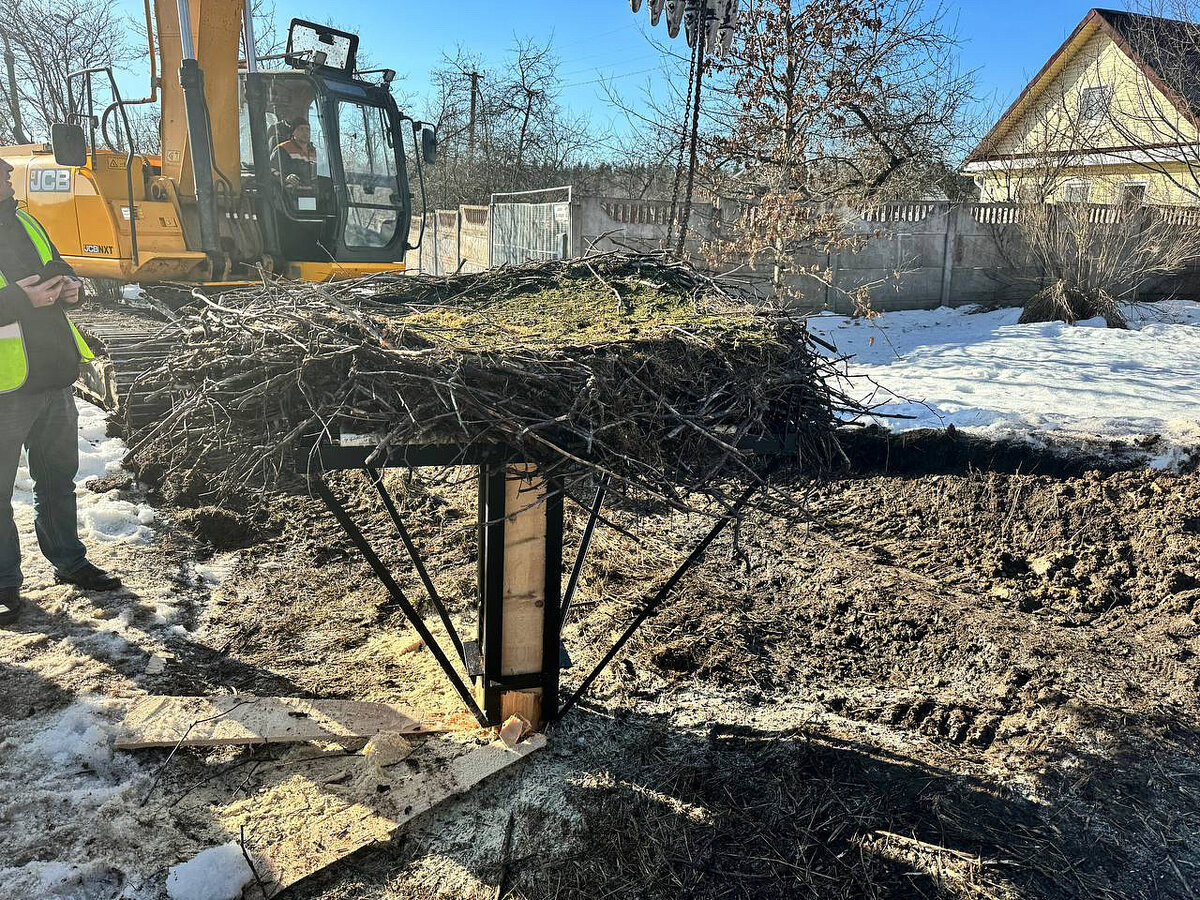 В понедельник дорожники перенесли птичий дом. Его не стали увозить далеко от старого места. Для переезда использовался манипулятор с краном — гнездо перенесли на специальную опору с платформой, которую специально подготовили для аистов.