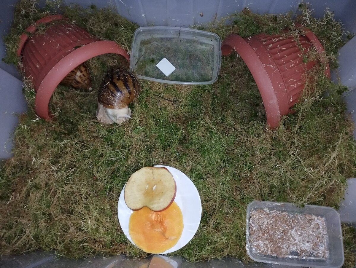 Уже как пару лет у меня живёт пара улиток по национальности Тигровые Ахатины. И не обычные, а альбиносы. Очень долгое время они просто ползали, жрали корм как не в себя, и купались в своей ванне (что я им поставил в аквариум). Периодически таращась на меня своими длинными глазами, когда выходили из своей спячки, в которую систематически впадали на пару дней. Такая спокойная жизнь длилась примерно полтора года. А потом началось. Из аквариума по ночам, а брюхоноги как раз ночные ребята, стал доноситься грохот, какое-то непонятное сопение (чем они это делают – понятия не имею) и каждое утро я обнаруживал у них адский погром. Ночью Ахатины стали меньше спать, а днями начали гоняться друг за другом (сшибая все свои тарелки и миски), а догнав, кататься на панцире товарища. Я списывал это безумство брюхоногов на магнитные бури и всепланетарную проблему потепления климата. И вот в один день, совершенно случайно, копнул мох, которым уложено дно в аквариуме и обнаружил кладку яиц. О! Зашибись, п