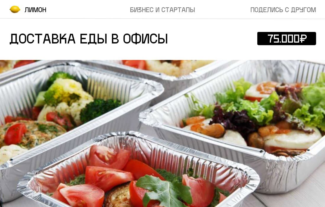 Бизнес Идея: Доставка еды в офисы Стартовый капитал: от 75.000₽ Ниша потихоньку заполняется крупными компаниями: «Яндекс.Еда» пока вне конкуренции, но мелкие фирмы готовы предоставить более качественное обслуживание. Вы можете спросить: «Как же мне с мелким бюджетом отобрать долю у Яндекса?». Не стоит списывать новичков на рынке — они имеют своё преимущество. Большие бизнесы вынуждены бороться с «акулами индустрии», выделяя бо'льшие бюджеты на сервис и рекламу. При этом владельцы не имеют права сильно занижать цены, чтобы привлечь внимание аудитории при сравнении с конкурентами. Ваши целевые люди — офисные сотрудники, которым лень спуститься к первому этажу за пончиком. У кого нет возможности носить обед с собой, возможно, станут вашими постоянными клиентами.