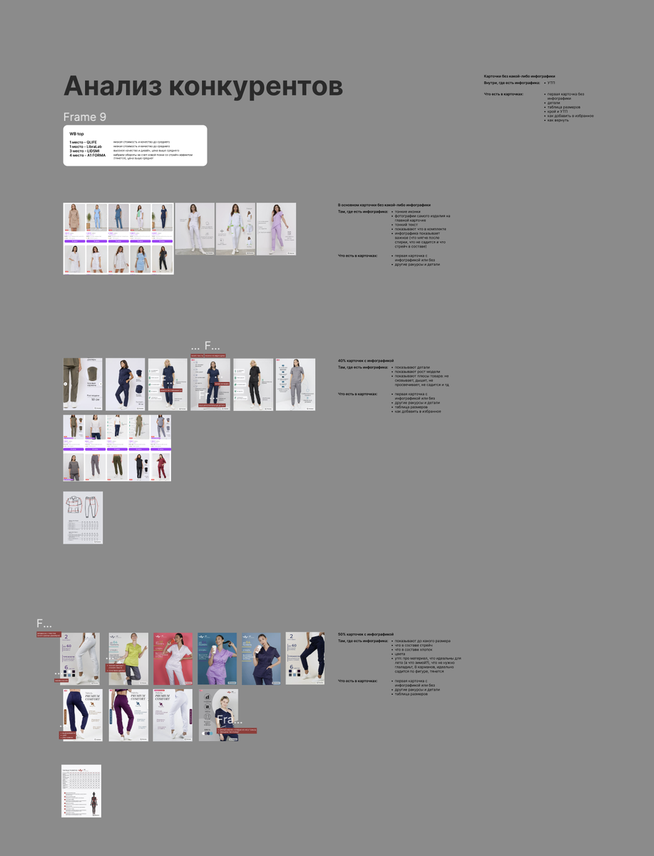 Я думаю, что мы все привыкли, что карточки на Вб выглядят ну просто отвратительно. Постоянно какие-то невероятно яркие цвета, куча шрифтов и все абсолютно рандомно расположено. Я очень долго. сэтого бомбила, но вот появился шанс показать КАК МОЖНО и сделать реально крутые вещи. Итак, ко мне обратилась заказчица, которая занимается производством медицинской одежды с запросом сделать реально классно и минималистично, а не очередное нечто от которого вытекут глаза. Я выстроила такой таймлайн нашей работы 01. Анализ ЦА и конкурентов Я провела большое исследование: подготовила опросники и провела кастдевы с людьми из нашей целевой аудитории. С помощью этого анализа я поняла на что стоит обратить внимание: какие слайды должны быть в карточке, что людям важно увидетьна каждой карточке и какой визуал подобрать. 02. Сбор референсов Когда мне стали понятны основные запросы ЦА я начала формировать Референсы ив итоге у нас получилось три концепции: более минималистичная, с формами и более яркая.
