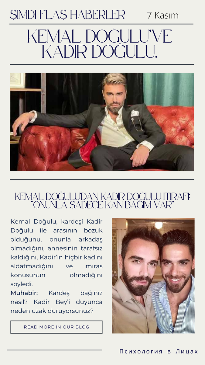 В конце февраля во время встречи с представителями прессы Кемаль Догулу - известный в Турции стилист, танцор и певец - сделал громкое заявление о своём брате Кадире Догулу: «Мы связаны только кровными узами. Никакой дружбы между нами нет». Признание Кемаля Догулу: «Нас связывают только общая фамилия и кровь». После творческого вечера в Нишанташи 44-летний исполнитель на вопросы журналистов канала «Репортер Онлайн» неожиданно заявил, что у него всегда были плохие отношения с братом, что мать никогда не вмешивалась в конфликт, и что Кадир - крайне порядочный человек и не изменял ни одной из своих женщин: «После того, как в 2017 году не стало моего отца, мама заняла классическую позицию нейтралитета, не вникая в разногласия между нами. С лета прошлого года я не раз говорил (?), что нас с братом связывают только кровные узы. Не скрою, - на это есть определённые причины. Об этих причинах знает Кадир, знает мама, знает вся моя семья. Никому другому знать об этом не обязательно... Человек мож