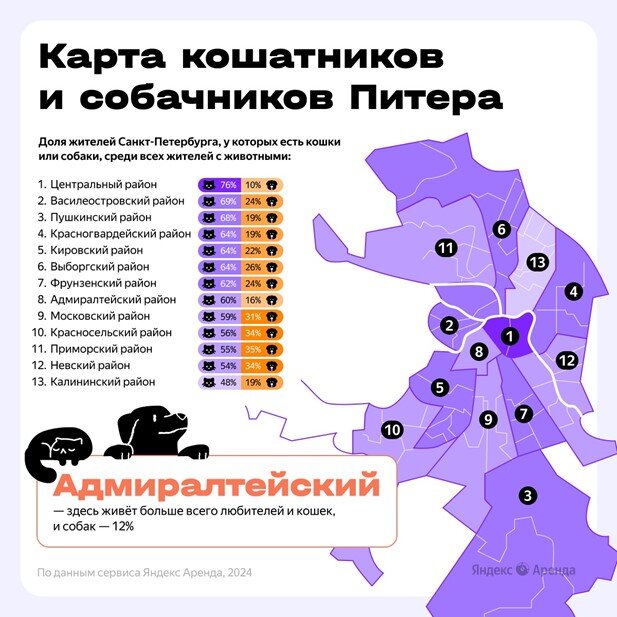 Больше всего владельцев кошек и собак одновременно живут в Адмиралтейском районе, тут у 12% жильцов с животными сразу оба питомца.