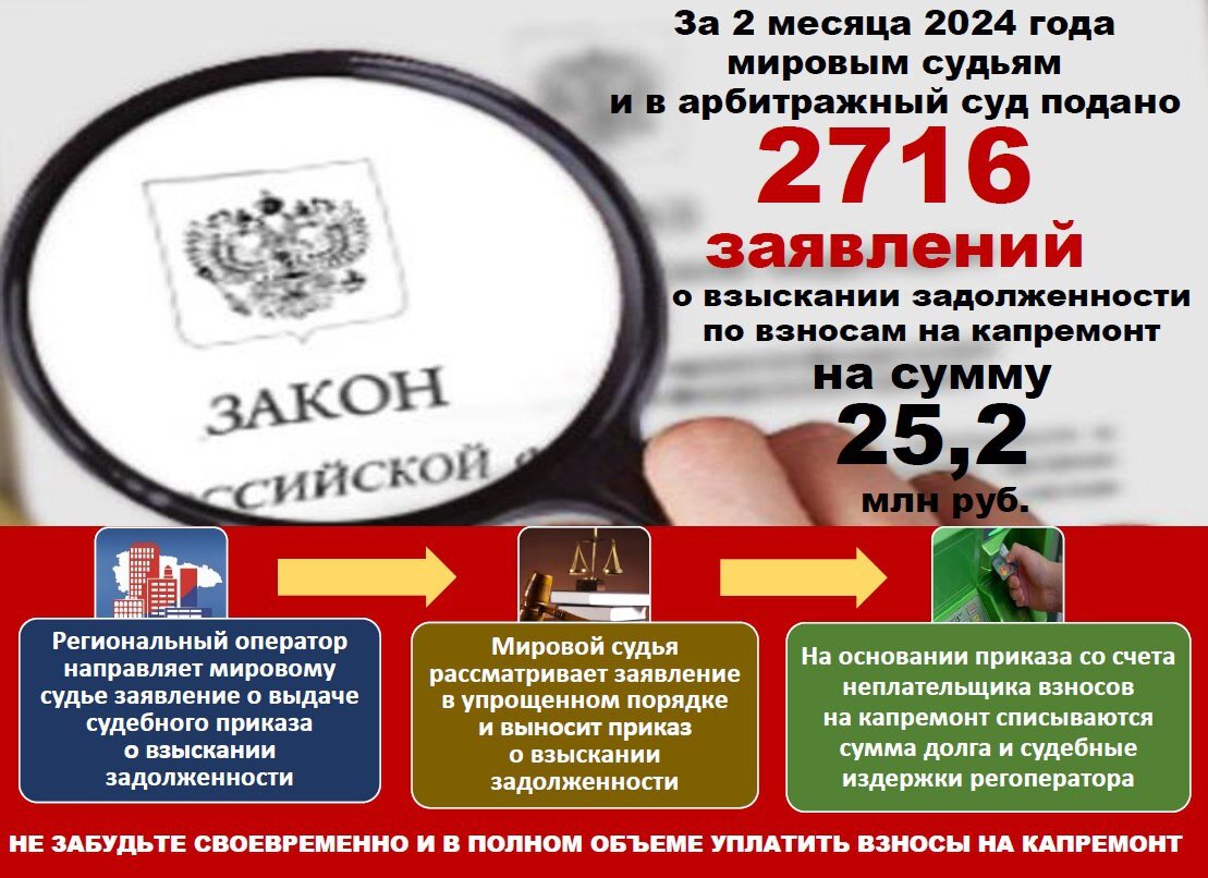 Из них 21 млн рублей с физлиц и 4,2 млн — с организаций, владеющих помещениями в многоквартирных домах. Мировые суды решения о долгах до 500 тысяч принимают без вызова сторон. Затем выписывают судебный приказ, и по нему уже со счетов должника снимают деньги в счета долга. Причем не только сам долг, но и пени с пошлиной.