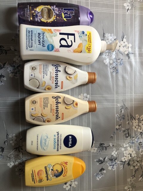 Здравствуйте все кто меня читает. Вчера собралась поменять нам всем зубные щетки.Полезла на верхнюю полку шкафчика в прихожей,там у меня хранятся всякие флакончики,тюбики,баночки-муж называет все это одним емким словом МЫЛЬНО-РЫЛЬНОЕ)))) ну и щетки зубные ,соответственно,там же. И решила я ,как то внезапно,провести на полке ревизию.Чего там наставлено уже и не помню. Нам на праздники часто дарят такие мелочи и друзья и родня,а я на полочку ставлю, вот там уже и скопилась кучка не маленькая. Достала я все оттуда и начала сортировать. Итак..Мужские гели для душа А это женские-тут поскромнее))Ну это и понятно-мужчин то двое им и надо в два раза больше))) Шампунь мужской А это женский. Для бритья и после бритья, А это зубные пасты. Дезодорантов,как оказалось,практически нет.Нужно прикупить. Ну и виновники торжества из за которых и произошла вся эта ревизия Вот думаю,куда я все это набрала и когда же все это используется?А впереди еще столько праздников и явно снова надарят чего нибудь эд