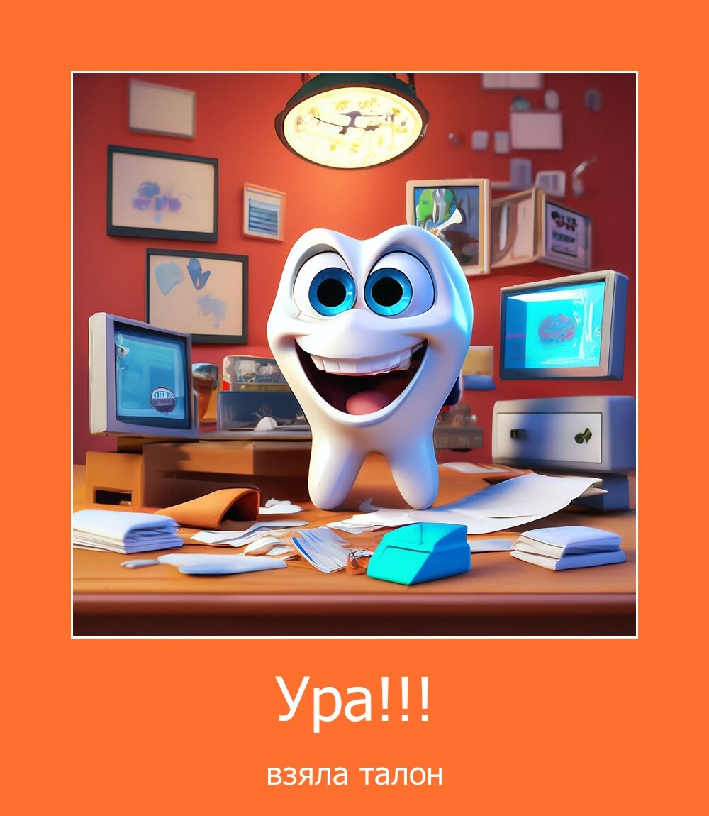 Привет Кто читал, в курсе дела про квест со взятием талона к зубному) Итак, вчера сидела до 24.00, чтобы записаться к стоматологу. Засыпала, просыпалась. Из-за чего состояние было весьма издерганное. Все таки заснула. Просыпаюсь-время - 0:06, бегом включать сайт (глаза при этом посылают друг друга на хутор бабочек ловить), а там-облом! Все так и же и висит, что талоны будут доступны с ..... Подождала еще 5 минут и все, не выдержала , заснула) Просыпаюсь в 4.00, опять на сайт-недоступно. Просыпаюсь в 5.50 -захожу-О, Боги!-смотрю, что запись пошла, записалась на 18 марта на 8.00 утра. Фух. Но потом предстоит еще один зуб рвать...Так что надо еще время ловить)) Ну хоть узнала, что запись начинается где то с 5.00 или с 5.30 утра...) Квест окончен)