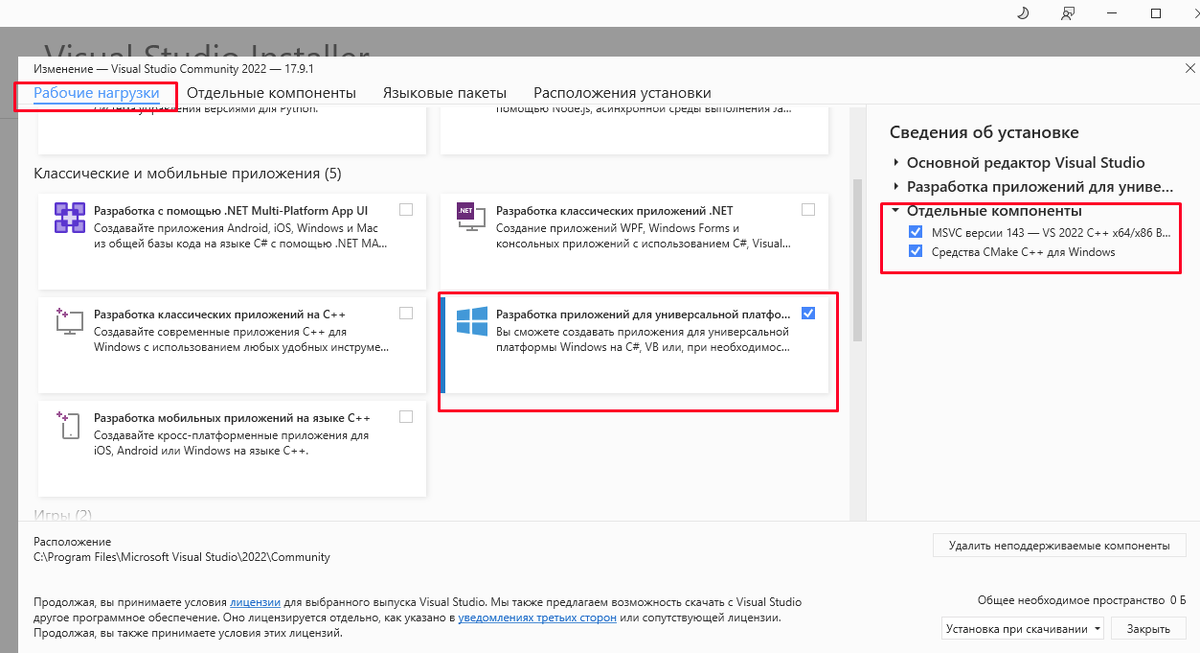 По умолчанию команда "pip install llama-cpp-python" поставит llama-cpp-python без поддержки ускорения на GPU. Для поддержки различных вариантов необходимо использовать переменные окружения (документация на github https://github.com/abetlen/llama-cpp-python): OpenBLAS (CPU): CMAKE_ARGS="-DLLAMA_BLAS=ON -DLLAMA_BLAS_VENDOR=OpenBLAS" cuBLAS (CUDA): CMAKE_ARGS="-DGGML_CUDA=on" CLBlast (OpenCL): CMAKE_ARGS="-DLLAMA_METAL=on" и тд. Так как производится сборка llama.cpp необходимо установить Cmake, использовал установку через VisualStudio (скачать можно тут https://visualstudio.microsoft.com/ru/downloads/): Для корректной сборки необходимо установить CUDA Toolkit(https://developer.nvidia.com/cuda-downloads?target_os=Windows), обновить драйвер видеокарты Установку производил в виртуальное окружение Conda: 1. Добавляю переменные окружения PowerShell: set-Item -Path env:CMAKE_ARGS -Value "-DGGML_CUDA=on" set-item -Path env:FORCE_CMAKE -Value 1 *Вторая нужня для пересборки, если ранее уже прои