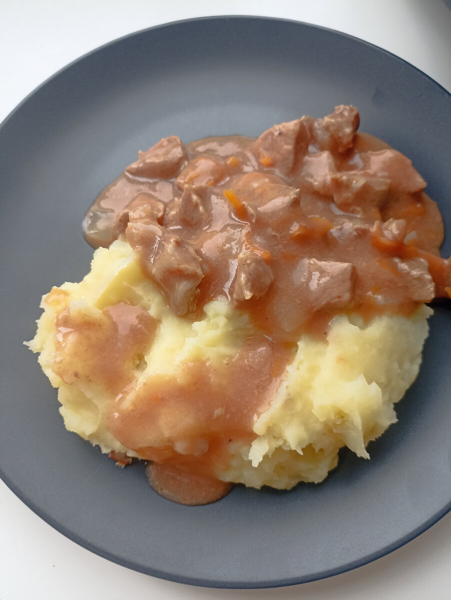 Тушеная говядина с гарниром. Салат "нежность" Кекс с маком. Приготовление: Гуляш в мультиварке. Ингредиенты: Мясо: у меня говядина, но можно взять любое. Лук. Морковь. Томатная паста. Приготовление: Всё очень просто. Мясо режим небольшими кусочками, лук режем мелко, морковь натираем на терке, затем всё перекладываем в чашу мультиварки добавляем немного воды. Ставим на режим тушение и через 2 часа у вас вкусное и мягкое мясо готово. Если подлив получился жидким, просто добавьте немного муки. Мясо подаем с любимым гарниром. У меня это картофельное пюре и Греча. Салат "нежность" Ингридиенты: Отварное куриное филе. Грибы шампиньоны (у меня лесные грибы). Лук. Майонез. Отварная картошка. Сыр. Отварное яйцо. Приготовление: Грибы обжариваем на сковороде и немного подсаливаем, затем нарезаем куриное филе кубиками, натираем сыр, натираем яйца и натираем картошку, затем режим мелко лук. Слои: Картошка. Куриное филе. Лук. Грибы. Яйцо. Сыр Каждый слой смазываем майонезом. Кекс с маком. Ингридие