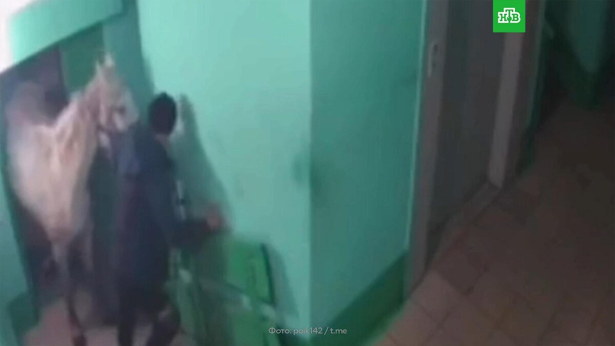 Инцидент попал в объектив камеры видеонаблюдения. На кадрах видно, как мужчина завел белую лошадь в подъезд, а затем безуспешно пытался на нее сесть.