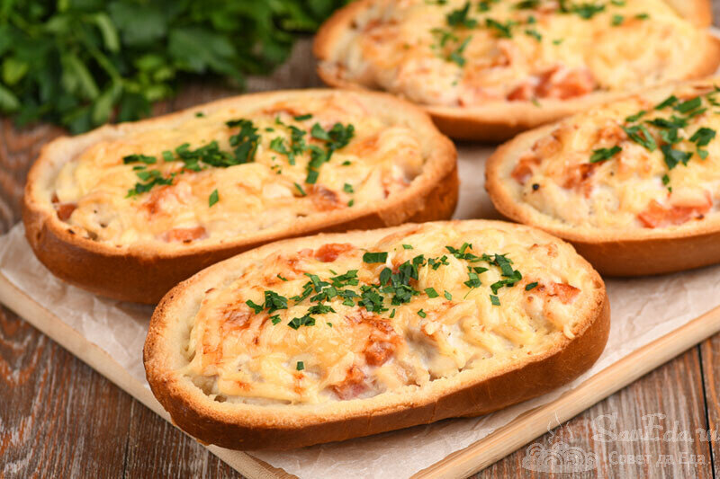 4. Для приготовления беру небольшие батоны (длина около 16 см). Разрезаем их пополам, верхние части немного подрезаем, чтобы были устойчивые. Вынимаем мякиш.