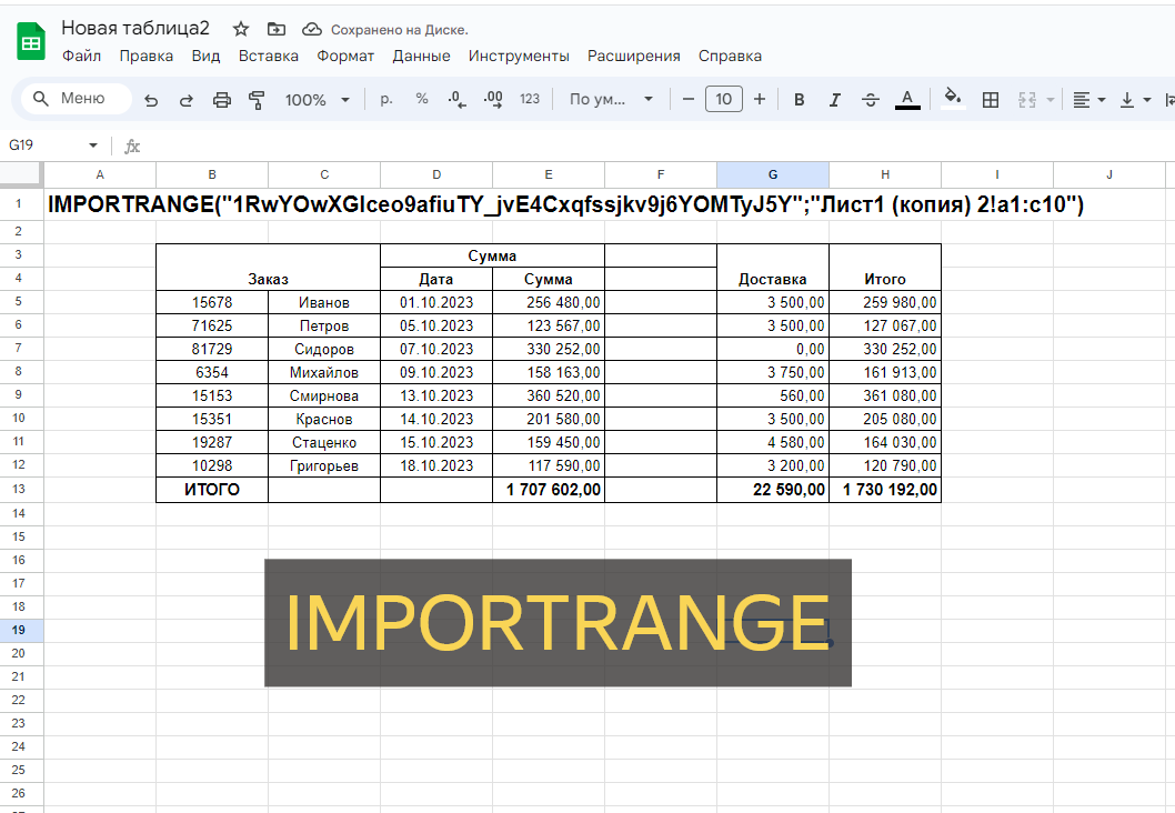 IMPORTRANGE(url_таблицы; диапазон)