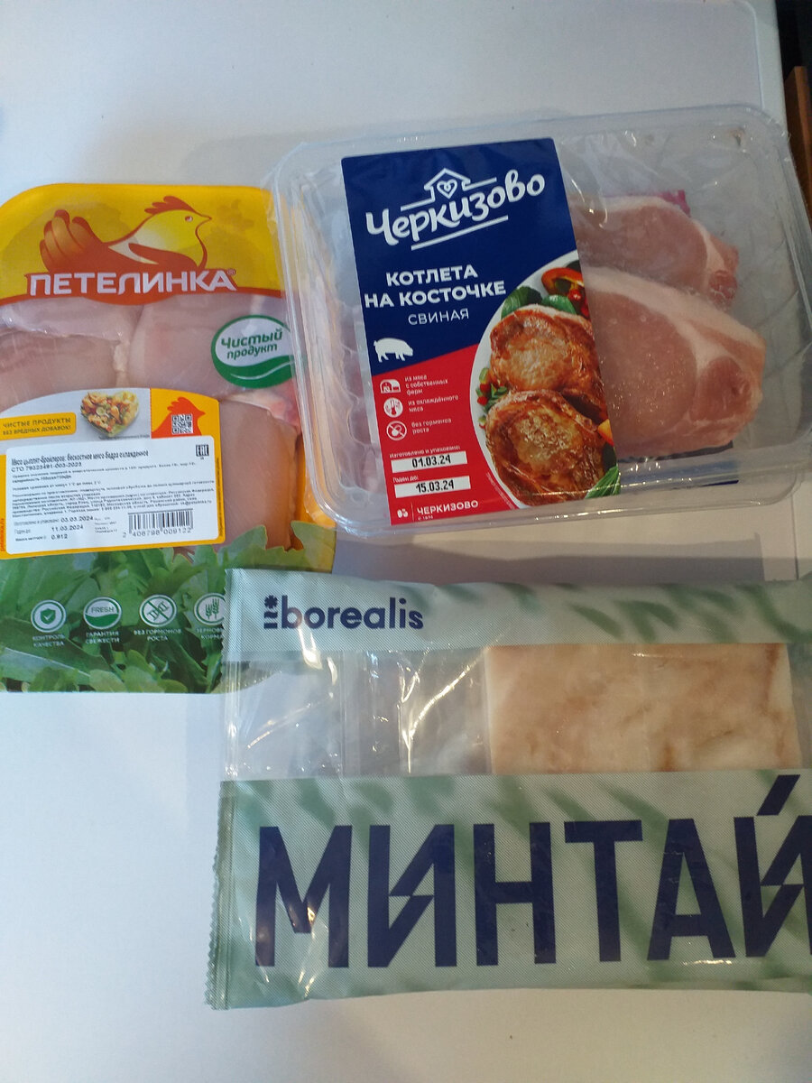 Минтая и мяса по 2 упаковки.