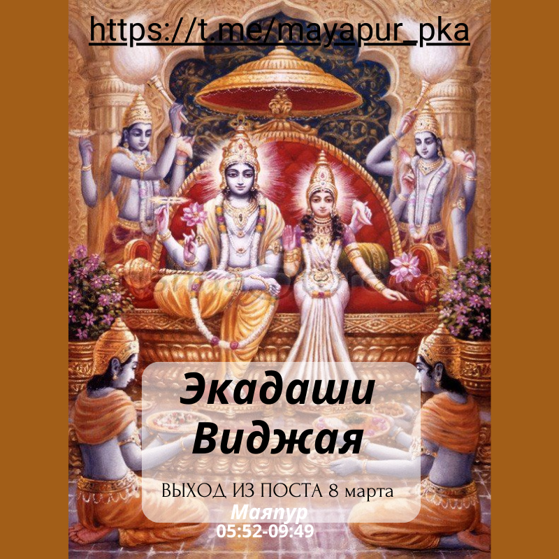О Нарада, сын мой, ты можешь понять из этой истории, что надо правильно соблюдать пост в этот Экадаши, строго следуй правилам и предписаниям. Сила этого поста может уничтожить все греховные реакции самого отвратительного человека”.