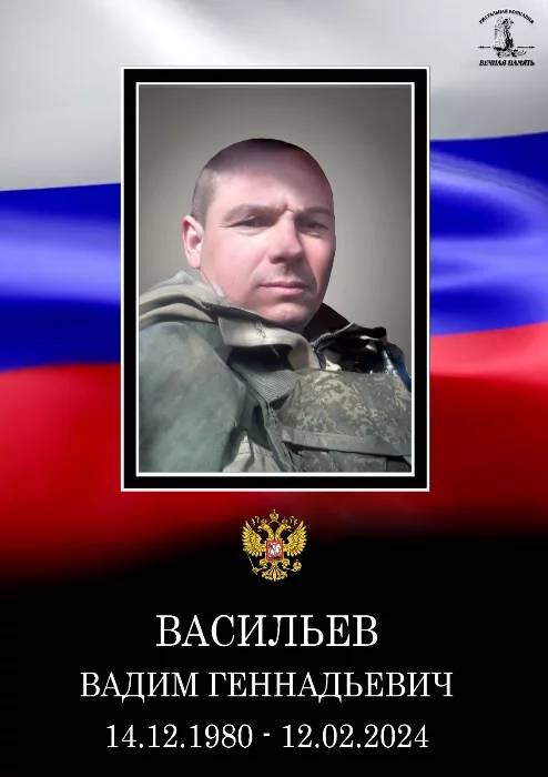 43-летний Васильев Вадим Геннадьевич погиб в зоне проведения специальной военной операции 12 февраля 2024 года. Похороны бойца и траурные мероприятия состоятся 6 марта в городе Торопце. В 10:00 начнётся гражданская панихида в зале МБУ ТР РДК на улице Советская, 36. В 11:20 начнётся траурная церемония и захоронение с воинскими почестями на кладбище "Покровское" Торопецкого района Тверской области. Информация ритуальной компании "Вечная память".