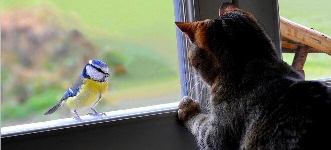 Василий приоткрыл один глаз, и не поднимая головы с лап, увидел, что с той стороны окна сидит синичка и так нагло заглядывает в окно.