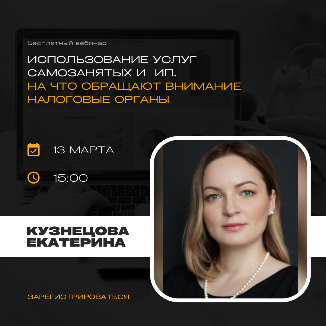Всем привет! Мы консалтинговая компания ООО "ПБУ", которая предоставляет комплексные юридические, бухгалтерские и налоговые услуги на рынке уже более 10 лет. Если у вас есть вопросы по ведению бизнеса в данных вопросах, можете обратиться к нам, написав в телеграм https://t.me/managerPBU. Приглашаем вас на бесплатный вебинар "Использование услуг самозанятых и/или индивидуальных предпринимателей. На что обращают внимание налоговые органы", который состоится 13 марта в 15:00.