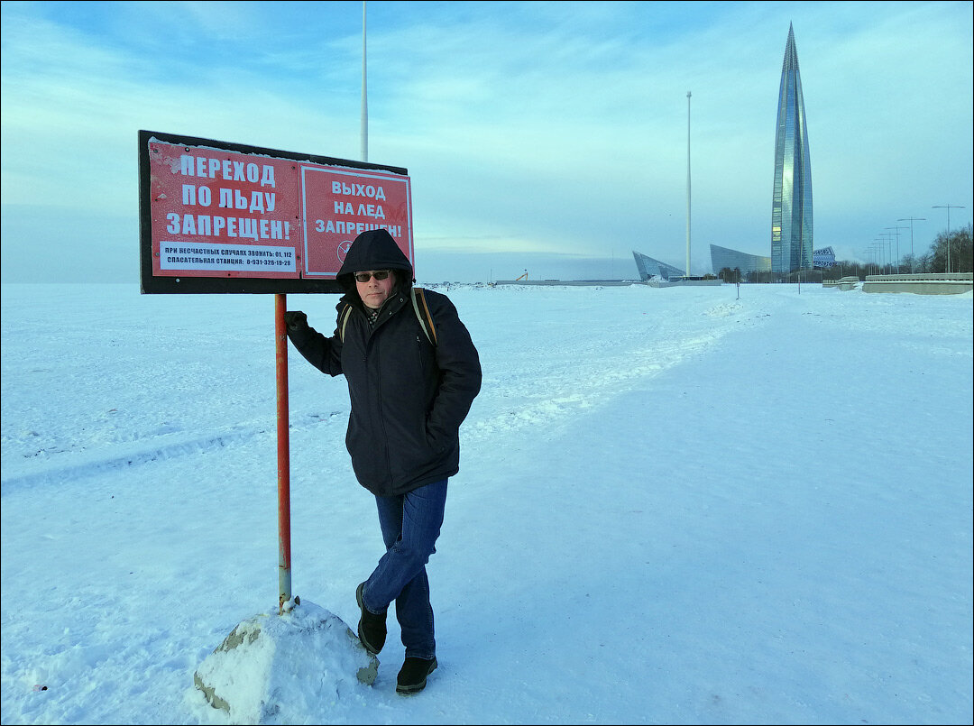 Но поднявшийся ветер вкупе с морозом выдавливал из глаз слёзы, лица стремительно обледеневали. Мы осознали, как везло нам все предыдущие — холодные, но относительно безветренные дни! Сейчас же, полюбовавшись на огромное здание Лахта-центра, высящееся над заливом, мы поняли, что идти к нему вовсе не хочется. Оставим до лучших времён!