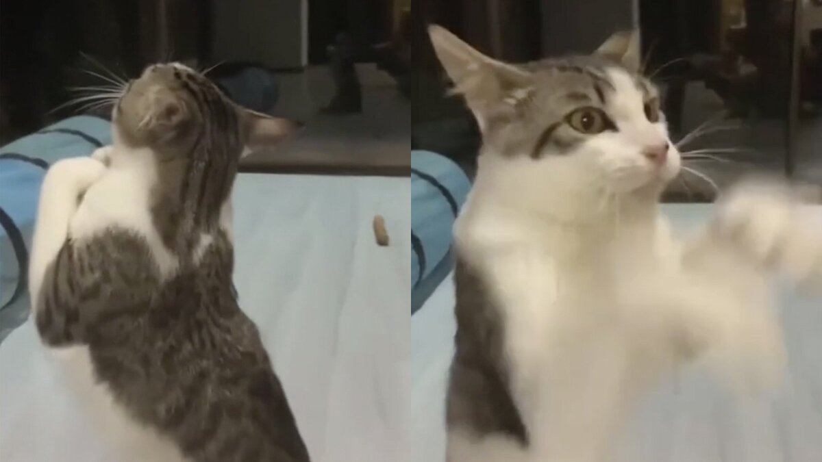 В ролике видно, как питомец внезапно встает на задние лапы, принимает стойку и начинает боксировать в разные стороны, будто отрабатывая удары. Стиль кота был весьма странным, но точно эффективным… на смех.