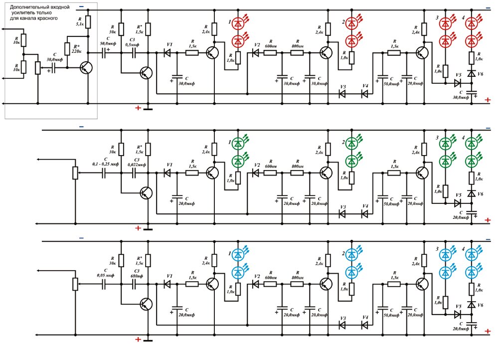 1. При малой емкости конденсаторов С3, и С4 частое мигание светодиодов на медленной музыке не соответствует мелодии, а при большой емкости не соответствует ритмичной музыке.