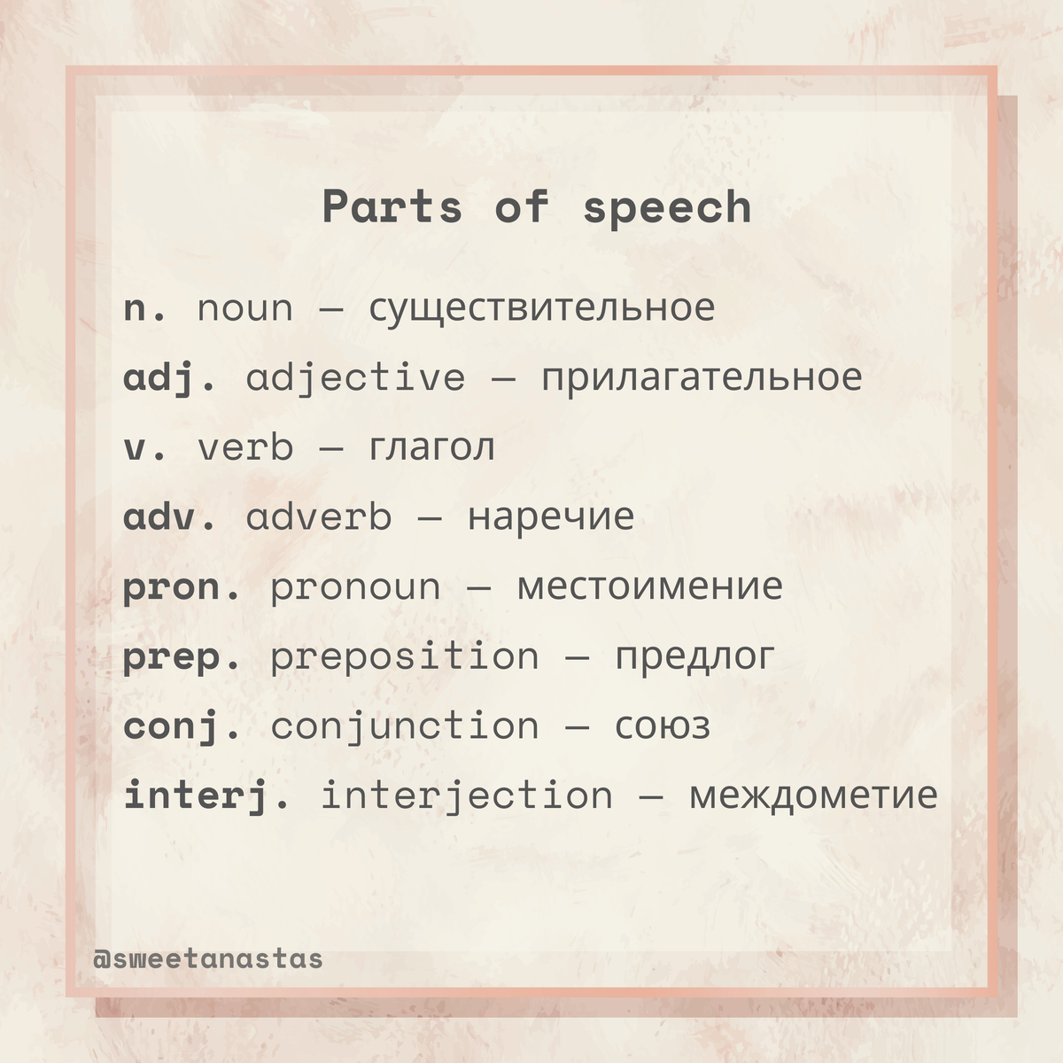 Examples: 1) Anna lives in Moscow. In bold — proper nouns (used to refer to specific people, concepts, places, or things). 2) He is kind. In bold — an adjective — a word that describes a noun or pronoun. 3) Anna lives in Moscow. In bold — verbs indicate what the subject of a sentence is doing. 4) They often behave badly. In bold — adverb of manner — an adverb is a word that can modify a verb, adjective, adverb, or sentence. 5) I don’t really know him. In bold — personal pronoun — a pronoun is a word used in place of a noun. 6) I wake up at 8 o'clock. In bold — time preposition — prepositions can be used to indicate aspects such as time, place, and direction. 7) He likes swimming and hiking. In bold — coordinating conjunction — conjunctions are used to connect different parts of a sentence (words, phrases, or clauses). 8) Ouch! I hurt my finger. In bold — emotive interjections — interjections ( a word or phrase) are used to ex