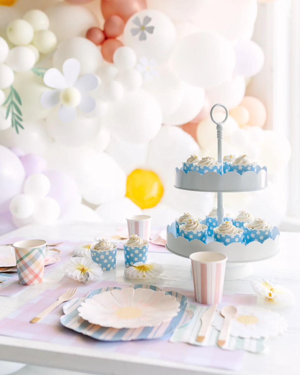 Ищете потрясающие идеи для вечеринки по случаю дня рождения дочки? Попробуйте оформить праздник ромашками — они создадут атмосферу тепла и уюта. Чистый белый цвет и серединка-солнышко кому угодно поднимут настроение 🙂 Будь то Пасха, детский праздник или день рождения для девочек — эта тематика идеально подойдёт! Кстати, эта тематика отлично подойдёт и для первого дня рождения ребёнка — мальчика или девочки. Мы советуем смешать пастельные и клетчатые акценты, чтобы выделить ромашки на таком фоне. На фото прекрасная посуда Meri Meri. Надувные ромашки или просто связки бело-жёлтых шаров отлично подойдут к такому оформлению. Или смело берите все пастельные цвета: На столе тарелочки-ромашки от Мери Мери — вроде простые, но из-за необычной формы станут настоящим украшением стола. И не забудьте букеты живых цветов! Они не только сделают праздник более пышным, но и наполнят комнату ароматом весны. Фон можно использовать не только клетчатый, но и цветочный. У нас огромный выбор тарелочек! Вы м