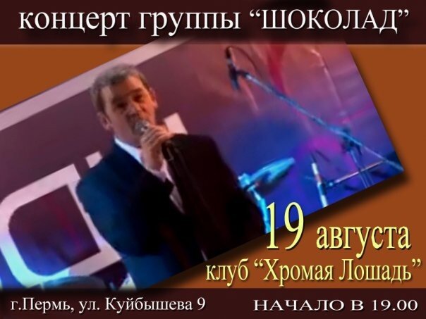 ИСТОРИЯ группы "ШОКОЛАД". Легендарная группа 80-х, 90-х.Группа Шоколад. «Хромая Лошадь» Не особо хотел писать про «Лошадь», но что-то навеяло. Все было просто и банально. Очень хороший барабанщик и организатор Андрей Владимиров предложил мне сделать программу с песнями гр. Шоколад. Ему нравились наши песни. У него был коллектив «Ретро» играли каверы, ну и просто достойные музыканты. Назначили время и место репетиций (ДК Калинина). Я дал музыкантам песни, которые хочу спеть. Парни подошли ответственно к работе, «сняли» все один в один, и я приехал на первую репетицию. Она прошла очень продуктивна, внес коррективы во все песни. На второй репетиции еще подкорректировал некоторые моменты. На третьей и четвертой прогоняли всю программу от начала до конца. Я назначил 20 песен гр. Шоколад и это получилась концертная программа. Она была готова. Андрей, как организатор, предложил выступить в какой-то «тусе» (до сих пор не помню, что за мероприятие было) в Wonder Hall (это бывший кинотеатр «Росс