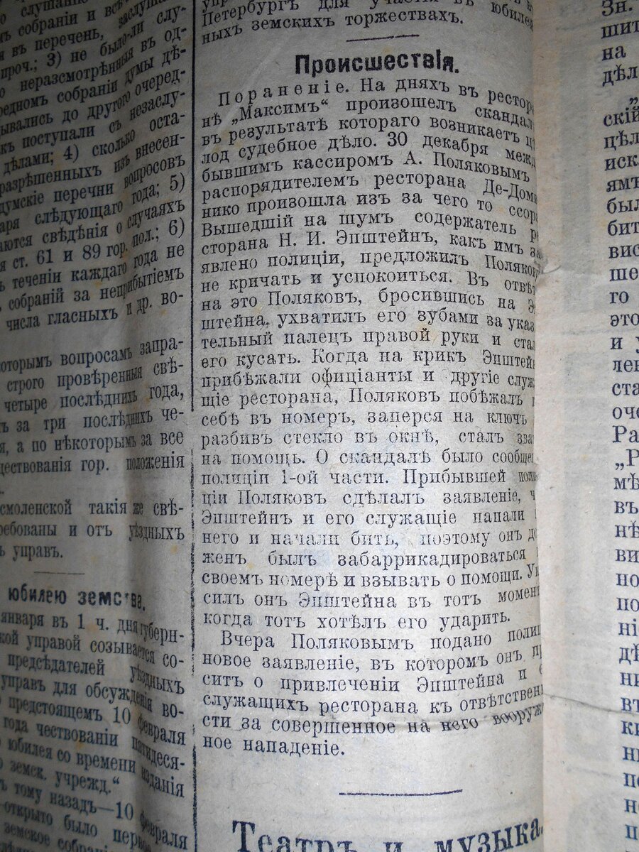 На днях в ресторане Максим произошел скандал в результате которого возникает целое судебное дело. 30 декабря между бывшим кассиром А. Поляковым и распорядителем ресторана Де-Доминико произошла из-за чего-то ссора. Вышедший на шум содержатель ресторана Н. И. Эпштейн, как им заявлено полиции, предложил Полякову не кричать и успокоиться. В ответ на это Поляков, бросившись на Эпштейна ухватил его зубами за указательный палец правой руки и стал его кусать. Когда на крик Эпштейна прибежали официанты и другие служащие ресторана, Поляков побежал к себе в номер, заперся на ключ, разбив стекло в окне, стал звать на помощь. О скандале было сообщено полиции 1 части. Прибывшей полиции Поляков сделал заявление, что Эпштейн и его служащие напали на него и начали бить, поэтому он должен был забаррикадироваться в своем и номере и возвать о помощи. Укусил он Эпштейна в тот момент, когда тот хотел его ударить. Вчера Поляковым подано новое заявле