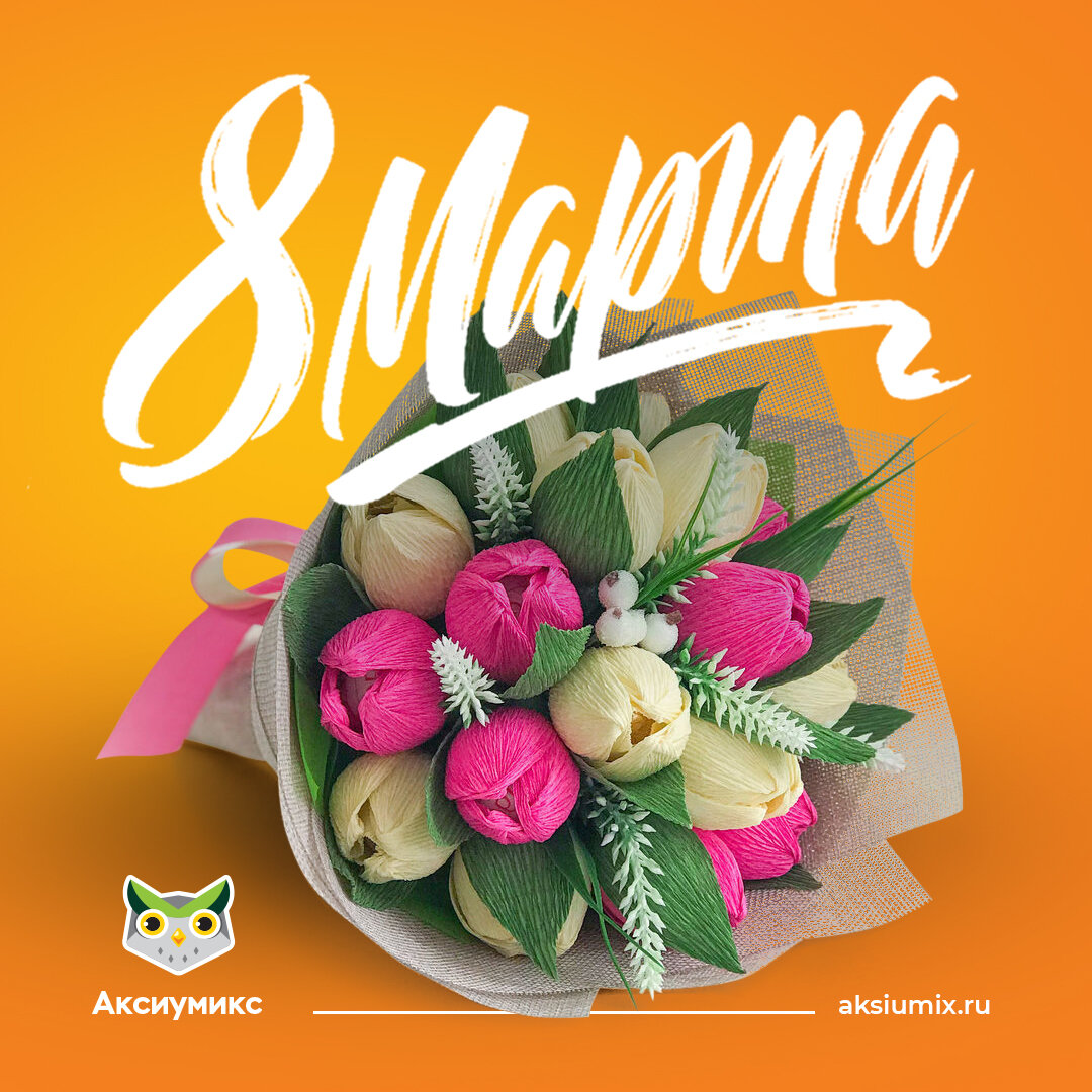 Какое поздравление с 8 марта станет не только приятным сюрпризом маме, бабушке, сестре, подруге, но и вкусным / полезным подарком? Правильно, - съедобный и сделанный своими руками…букет! 💐 Аксиумикс предлагает простой вариант поделки – весенний букет из бумаги с конфетами внутри! Можно сделать тюльпаны, крокусы, розочки - тем более, если в ваших широтах весенних цветов нет. Вам понадобится: цветная гофрированная, папиросная или воздушная упаковочная бумага, деревянные палочки, бумажная лента-тейп, двухсторонний скотч, нитки в тон бумаги, конфеты в форме шара или овала. Приступим: 1. Режем бумагу на продольные полоски: 3 х 15 см. Каждую полоску в центре складываем пополам и перекручиваем на один оборот - получаем объем для лепестка. Получившуюся вершинку нужно приплюснуть пальцами и сделать острый кончик - это и есть лепесточек, который мы закруглим вовнутрь бутона. Для одного цветка достаточно трех лепестков, если хотите попышнее, сделайте 5-6.