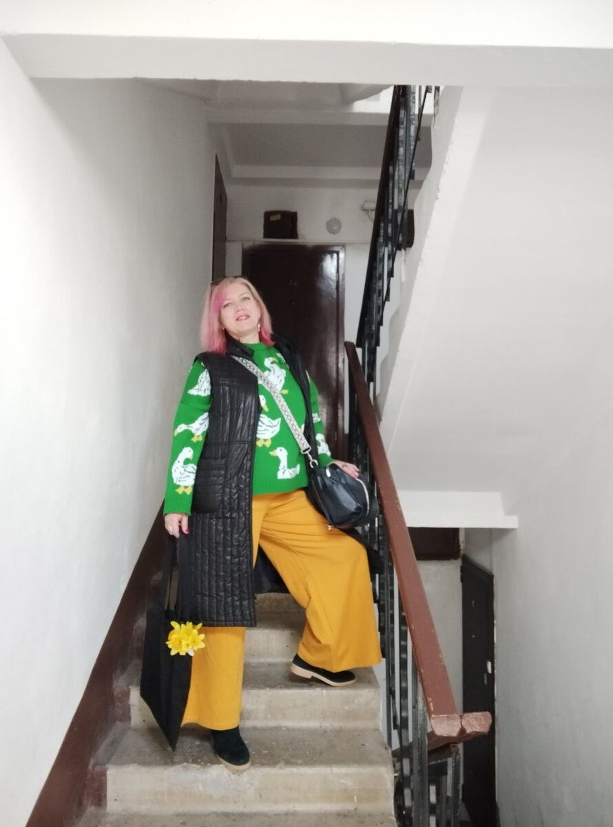 Свитер (1030 руб) и брюки (600 руб) с WB. Такие же брюки у меня есть красные. Их я купила первые. Потом на желтые брюки была хорошая скидка, купила и их.