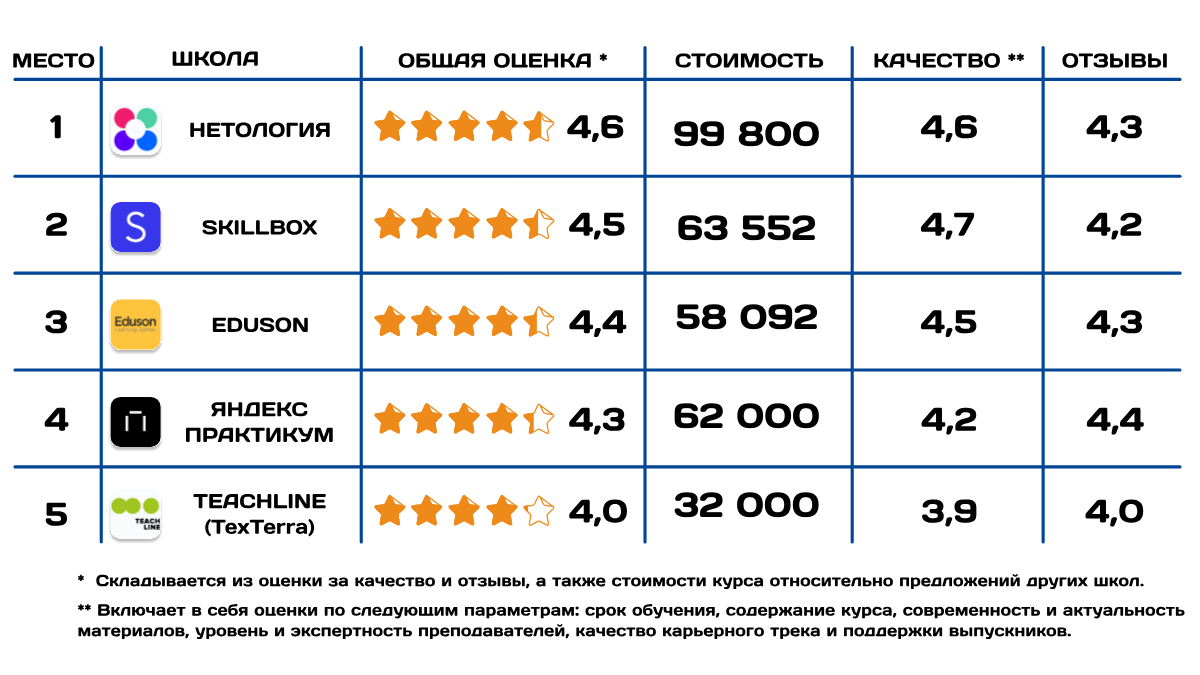 Отзывы. При составлении ТОПа мы учитывали отзывы выпускников и их истории успеха, а также общий рейтинг курсов и школ.