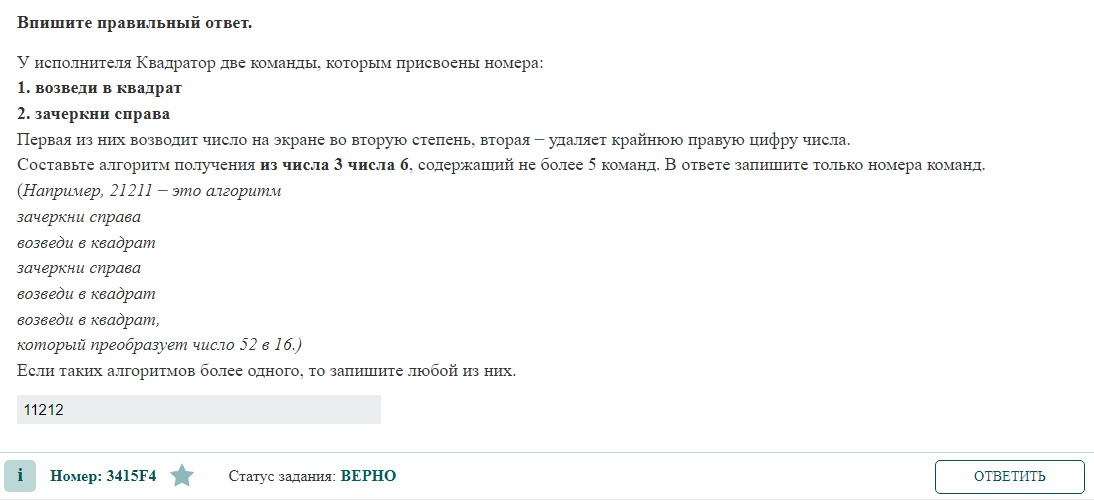 У исполнителя Квадратор две команды, которым присвоены номера: 1. возведи в квадрат 2. зачеркни справа Первая из них возводит число на экране во вторую степень, вторая –– удаляет крайнюю правую цифру числа. Составьте алгоритм получения из числа 3 числа 6, содержащий не более 5 команд. В ответе запишите только номера команд. (Например, 21211 –– это алгоритм зачеркни справа возведи в квадрат зачеркни справа возведи в квадрат возведи в квадрат, который преобразует число 52 в 16.) Если таких алгоритмов более одного, то запишите любой из них. РЕШЕНИЕ 1. Число 3 однозначно, зачеркивать нечего, возводим в квадрат 3×3=9 Команда 1 2. Число 9 так же однозначно 9×9=81 команда 1 3. Если 81 возвести в квадрат, получится очень большое число, применим 2 команду 8 Команда 2 4. 8 число однозначно, возводим в квадрат 8×8=64 Команда 1 5. В числе 64 первая цифры 6, она нам и нужна, зачеркиваем цифру справа 6 Команда 2 Переписываем номера команд 11212 ОТВЕТ 11212