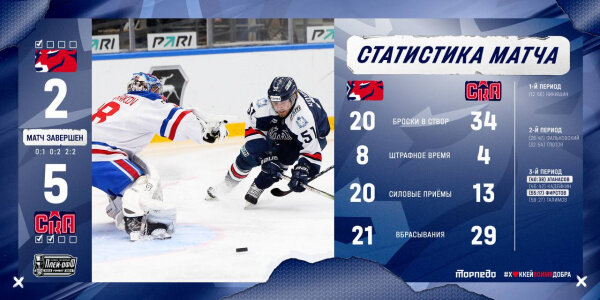 Армейцы выходят вперед в серии игр плей-офф между «Торпедо» и СКА. Счет на табло 2:5. А по итогам трех игр счет 2:1 в пользу СКА. Статистика матча: Броски: 34-73 ; Броски в створ: 20-34 ; Голы: 2-5 ; Вбрасывания: 21-29 ; Блокированные броски: 19-8 ; Силовые приемы: 20-13 ; Отборы: 7-10 ; Потери: 8-4 ; Перехваты: 14-9 ; Время в атаке: 11:40-18:59 ; Штраф: 8-4. В четверг, 7 марта "Торпедо" и СКА сойдутся в новом поединке.