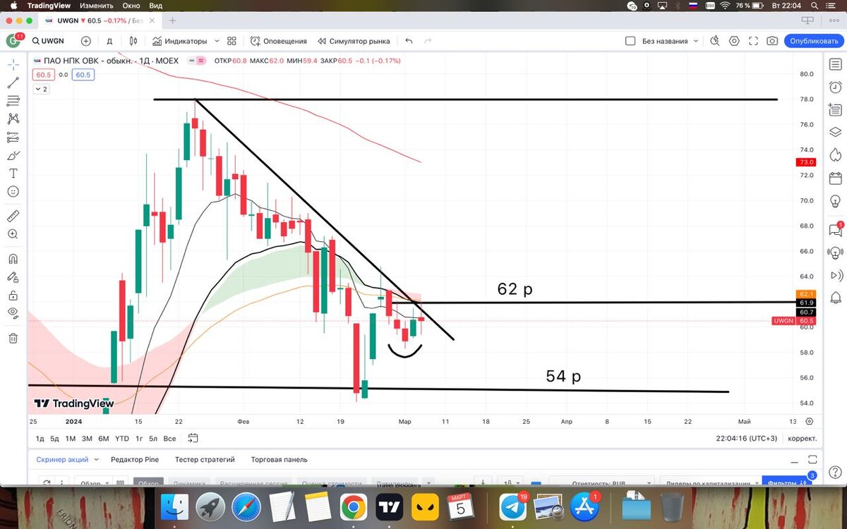 ОВК $UWGN - продолжаем поджиматься к наклонному сопротивлению, но на днях произошел отскок и мы нарисовали минимум выше предыдущего - позитив. Ближайшие значемые поддержки две: 58,3 р (новый минимум) и 54 р. Пробитием сопротивления на данный момент будет считаться 61 р, а лучше подождать пробития ема20 - 62 р. После того, как цена пробьет сопротивление - можно присмотреться к покупке, докупить можно будет при уверенном закреплении. Целей множество: 63, 67, 72, 78 р. Ждем завтрашних торгов, ведь если мы завтра нарисуем хорошую бычью свечу - мы пробъем уровень 🤝 Обязательно подписывайся на наш телеграм канал 🤝