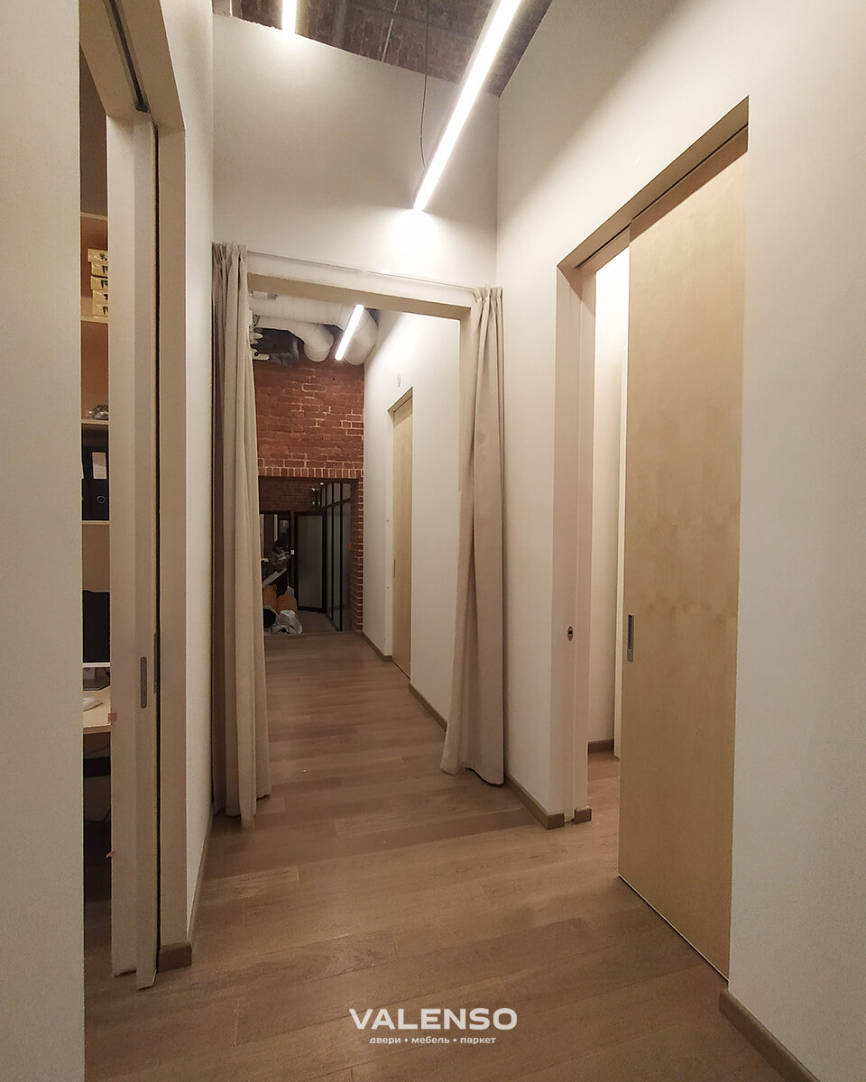 В интерьер этого офиса мы сделали три сдвижных двери. Полотна выполнены в отделке натуральным шпоном березы. В основе полотен: алюминиевый профиль белого цвета. Всё выдержано в цветовой палитре интерьера офиса. На фотографиях вы можете видеть, как хорошо здесь сочетаются природная текстура берёзы и белый профиль на дверях. Конструкция двери сдвижная, то есть полотно задвигается почти полностью в стену. Для этого в верхней части дверной коробки установлена направляющая. Эта направляющая — наша собственная разработка и выпускаем мы её самостоятельно. Одним из важных преимуществ нашего решения является возможность демонтажа направляющей без каких-либо лючков доступа и без необходимости что-то вскрывать в самой стене. Демонтаж простой и быстрый, а нужен он для обслуживания и настройки двери. На полотна мы установили итальянские врезные ручки в минималистичном дизайне. Часть ручек с сегментом под цилиндрический замок, а на двери, ведущей в санузел, установлена ручка с интегрированной санте
