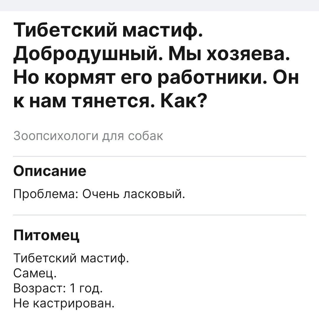На ресурсе поиска специалистов такие запросы встречаются иногда. Тут, в принципе, много вопросов. Ответы, к сожалению, получить не удалось. Из запроса рисуется следующее: мы, понимаешь, завели собаку, чтобы охраняла, а она - не охраняет. Вполне вероятно, что годовалый щен сидит на цепи, ему одиноко, страшновато, он тупеет от депривации и рад любому контакту с людьми. Впрочем, даже если не на цепи, но в игноре и на ограниченной территории - будет то же самое. Потому, что собаки, по природе своей, социальны. Им нужно быть в сообществе, чтобы чувствовать себя уверенно. И вот они, люди, ходят рядом каждый день. Он к ним тянется, конечно. А что ему ещë делать? Всюду пишут, что тибеты - отличные охранники. Но, чтобы охранять, собаке нужно иметь объект охраны. И вообще, брëх на всë шевелящееся - это не охрана. Охрана - это работа, которой учат. В зависимости от человеческой потребности, научить охранять можно периметр, сооружение, предмет, ребёнка, хозяина... Ключевое - НАУЧИТЬ. Это - свои