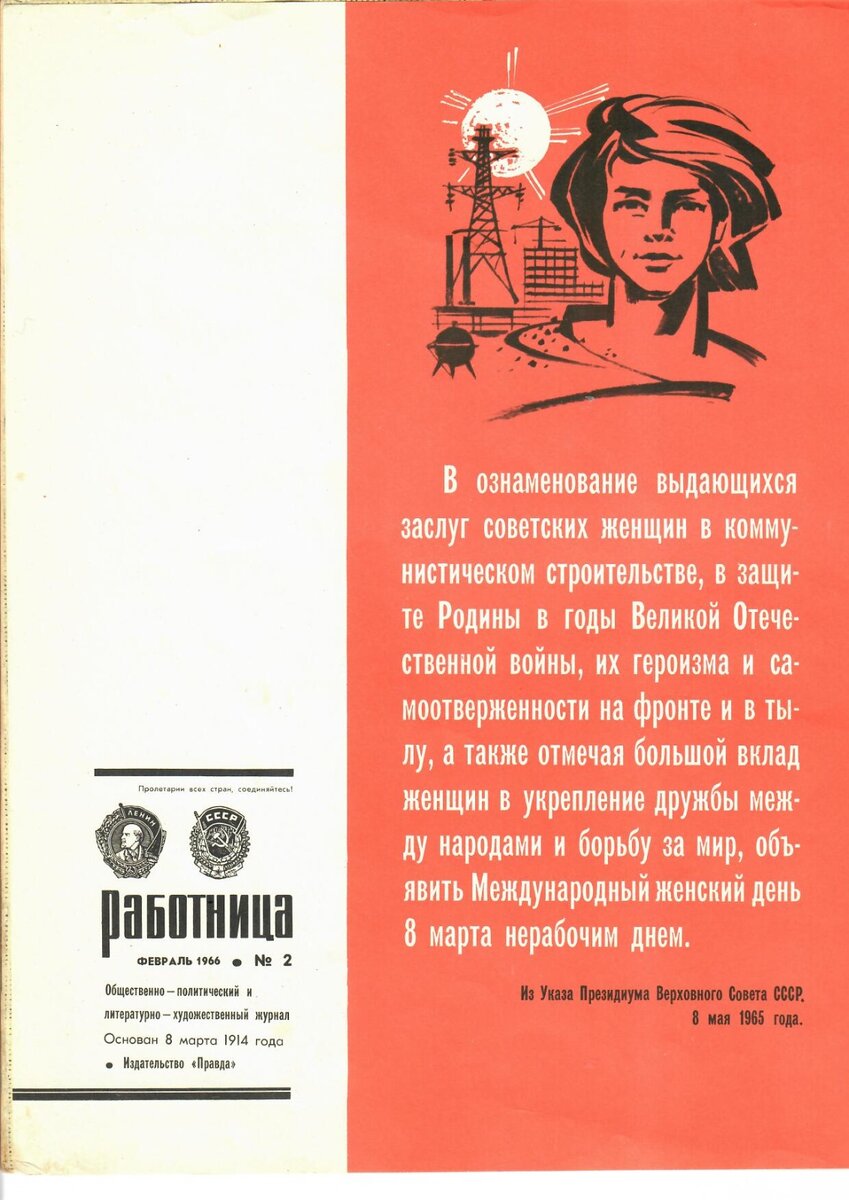 Первый весенний месяц традиционно ассоциируется с Международным женским днем теплыми женскими улыбками и подарками, а в нашей стране это еще и официальный выходной день. А как раньше отмечали 8 марта? Какие символы были связаны с этим праздником? На первой странице журнала «Работница» за февраль 1965 года приведены слова из Указа Президиума Верховного совета СССР от 8 мая 1965 года об объявлении Международного женского дня 8 марта нерабочим». Очень символично, что выписка из указа оказалась именно в этом журнале. Ведь общественно политический и литературно-художественный журнал «Работница» был основан 8 марта 1914 года издательством «Правда». 8 Марта был официально установлен государственным праздником в 1921 году и стал элементом советской политики, борьбы за мир во всем мире, символом прославления образа женщины-труженицы и матери. Журнал "Работница" долгое время пользовался популярностью у женщин Советского союза, а также в после перестроечное время до 2021 года. В 60 - 80 годы э