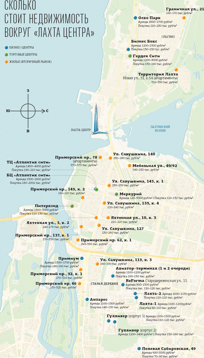 Цены на вторичном рынке Петербурга в районе "Лахта Центра" за минувший год выросли на 5–7% в зависимости от типа дома. В сегментах торговой и офисной невидимости — почти без перемен. Новых проектов в локации так и не появилось. По данным "Яндекс.Недвижимость", сейчас в активной продаже на вторичном рынке в районе "Лахта Центра" находятся 116 квартир (год назад их было 173). Самое дорогое жильё (точнее, апарты) продаются в МФК "Лахта Плаза". Здесь за 75 млн рублей можно купить 4–комнатную квартиру площадью 157 "квадратов". Также 4–комнатную жилплощадь (143 м2), но в проекте "Три ветра" предлагают купить за 49 млн рублей. Разница понятна — жилой дом, построенный ЛСР, находится ближе к ЗСД и дальше от "Лахта Центра". Цена большей части объектов, выставленных на продажу, — в диапазоне 10–15 млн рублей (56 штук). Ещё 39 квартир в этой локации стоят от 15–20 млн рублей, а 23 — от 5 до 10 млн рублей. Самый дешёвый вариант жилья — 1–комнатная квартира на 17–м этаже площадью 39,2 м2 за 7,6 млн