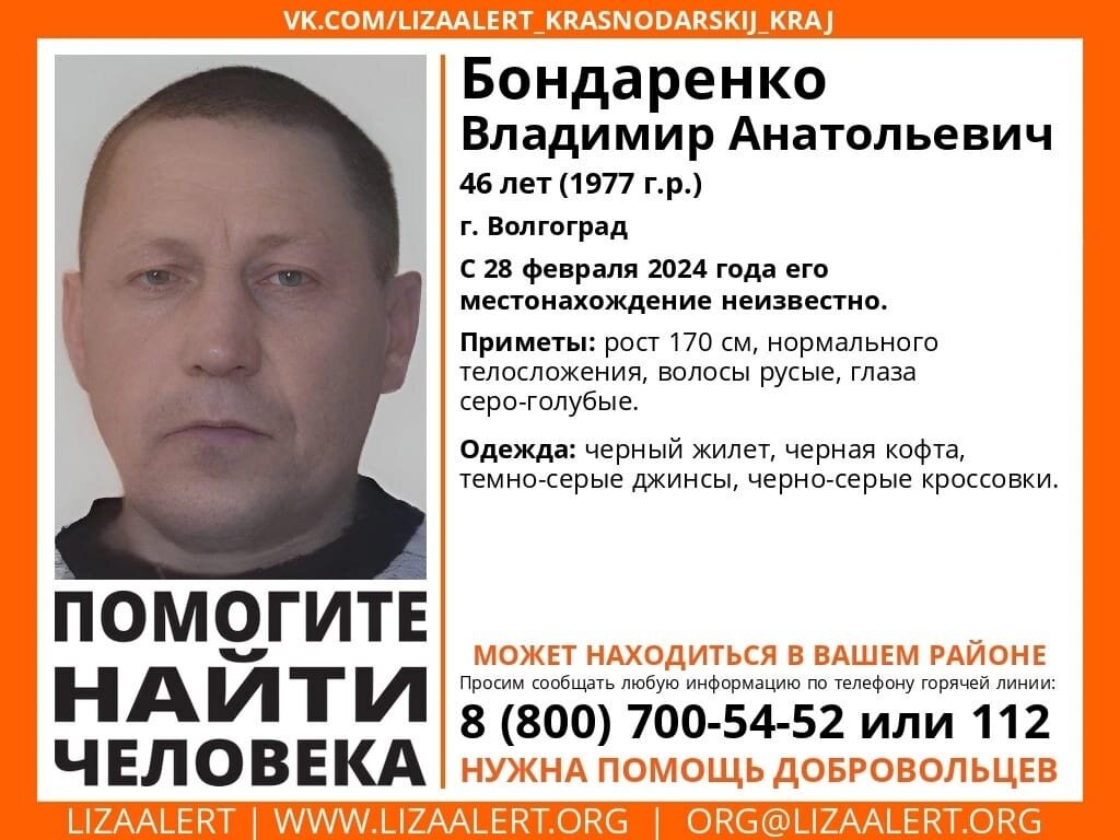 В Волгограде без вести пропал 47-летний Владимир Бондаренко. Известно, что мужчина пропал еще 28 февраля, но активно информацию начали распространять только сейчас. Владимир ушел из дома в Красноармейском районе. Сам он из Астрахани. Как отметили родственники, у мужчины на указательном пальце правой руки отсутствует фаланга. В день исчезновения Владимир был одет в черную водолазку, черную спортивную куртку с белой отделкой внутри, темные джинсы и кроссовки. Также на нем был черный жилет. У пропавшего мужчины русые волосы и серо-голубые глаза. Любую информацию о нем можно сообщить в правоохранительные органы. Уточняется, что он может находиться в любом районе, и нужны добровольцы для поисков. Ранее мы писали, что всего в Волгоградской области в феврале без вести пропали 35 человек. Из них 18 были найдены живыми, трое погибли. У двух человек нашли родных, две заявки оказались неподтвержденными. Информацию о трех людях передали федеральному проекту «Жди меня», одного человека доставили к