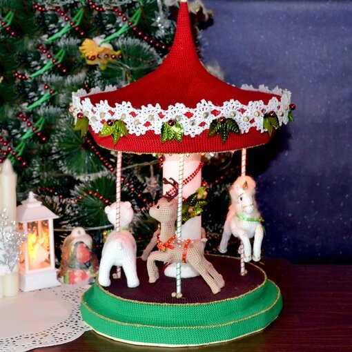 Кто не ищет легких путей? Я. Кто же еще. На каждый Новый год я старалась подготовить какой-нибудь интересный новогодний проект. Так у меня появился Щелкунчик с компанией Мари и мышиного короля. В очередной раз придумывая что-то этакое я решила создать новогоднюю карусель. Фишка карусели - подсветка. То есть вся композиция несла нагрузку детского ночника. Масштабно. Но тут сыграл роль мой максимализм - осилю или нет) В общем сама себя взяла на слабо. Первой появилась тестовая лошадка, которую я в итоге перевязала в единорога. Потом пришла очередь оленя. Олененок вообще отдельная история. Его белая попка так понравилась народу в запретограмме, что мк на всех зверет пришлось делать по отдельности. Да и самих оленят в качестве сувенира в этот же НГ я навязала штук 20. Далее слон. И заключительный житель карусели - полярный мишка Карусель получилась. Не просто получилась - она реально народу понравилась. Я решила продублировать ее еще и в летнем варианте, но увы сил не хватило. Все таки