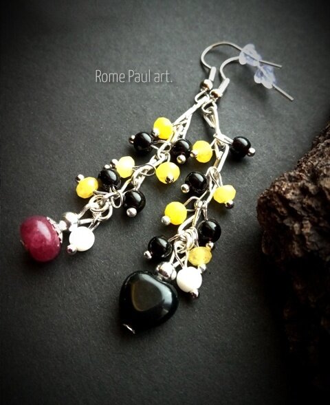 Авторские серьги-мини с натуральными жёлтыми и чёрными агатами-халцедонами и афганским розовым турмалином. Танцующие, играющие, изящные,притягивающие взоры! Каждый самоцвет наполнен сильнейшей энергетической силой, которая насытит любой истощённый потенциал, даст прилив положительных эмоций и поспособствует хорошему самочувствию. Материалы: розовый турмалин (5*8мм, ручная огранка, Афганистан), натуральный жёлтый\чёрный\белый агат (4мм, Аргентина), посеребренная фурнитура Длина серьги: 70 мм ...Одно из значений камня желтый агат – притягивать удачу и богатство в дом своего владельца. Он приумножает финансы, это связано с цветом минерала. Его свойство увеличивать плоды трудов помогут заполучить не только стабильный доход, но и исполнить мечты и планы. ...Сильное магическое свойство чёрного агата – защита от опасности, козней врагов, энергетических вампиров и атак. Агат защищает урожай (его можно дарить знакомым садоводам), пробуждает духовность человека, придает мужества и продлевает жиз