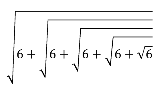 Необходимо определить, будет ли число, полученное из выражения больше или меньше трех? Для решения предположим, что полученное из выражения число больше трех: Чтобы неравенство оказалось верным, необходимо иметь в подкоренном выражении сумму числа 6 и числа, не меньше, чем 3. Это значит, что Затем И, наконец, Мы получили явное противоречие. Значит число, которое можно получить из предлагаемого выражения, меньше трех.