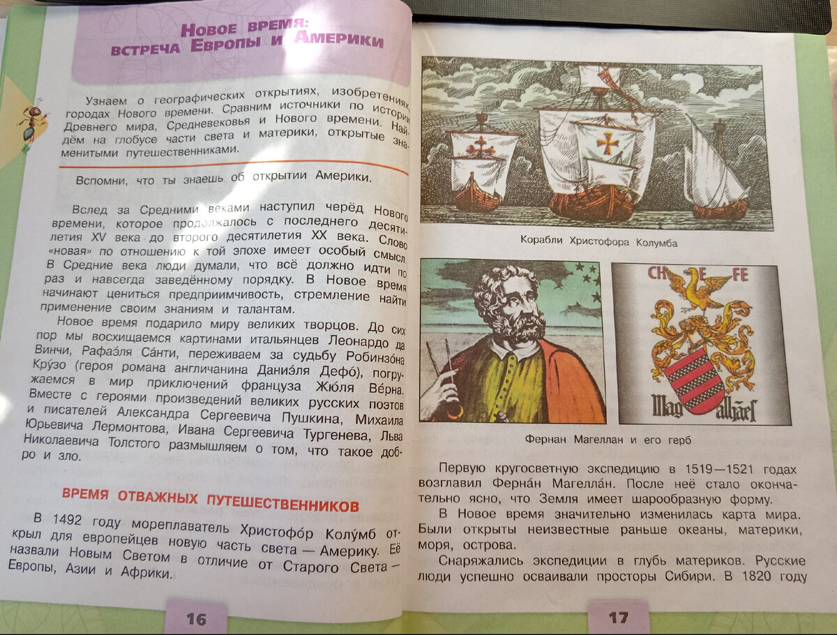 И опять "Окружающий мир" Плешакова. Попытаемся ответить на вопросы параграфа "Новое время: встреча Европы и Америки" из учебник "Окружающий мир, 4 класс. Не забудьте представить, что вы ученик 4-ого класса и у Вас нет знаний из истории человечества, а параграф дает очень мало информации. Чтобы не быть голословной , поделюсь фотографиями из учебника, сами сможете оценить информативность параграфа. Первый вопрос: Сочини рассказ об одном дне из жизни европейца конца 19 века. Используй в нем свои знания о технических новинках того времени. А какой был день европейца? Как его должны описать дети? Из вводной информации, что в то время было электрическое освещение, автомобили, радио, телефоны, метро. И что должны написать дети? " С утра европеец встает по будильнику, установленному на телефоне. Включает свет, кипятит электрический чайник или заваривает кофе. Завтракает под звуки радио. После завтрака садится в своей автомобиль и едет на работу." Я бы на месте ребенка написала именно так. Де