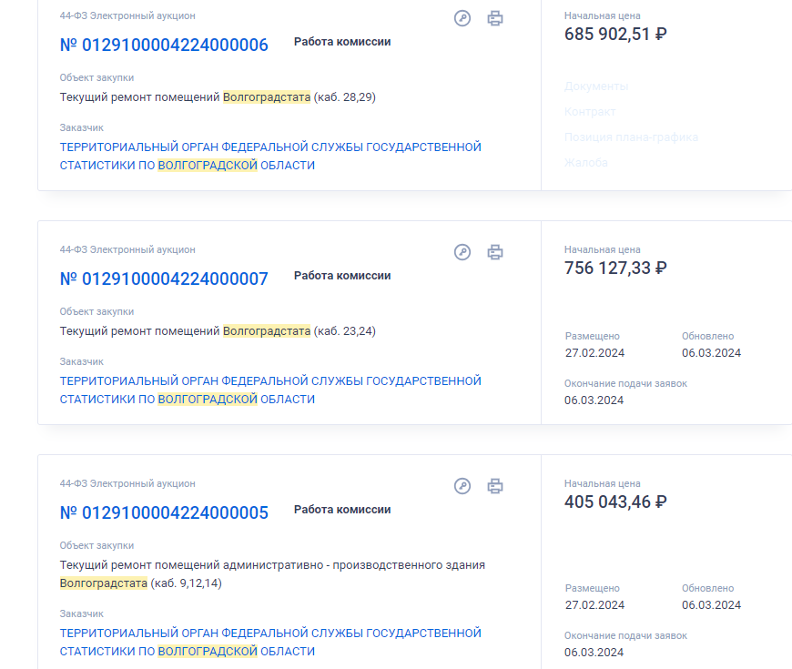 Волгоградстат объявил закупку на текущий ремонт нескольких помещений почти за 2 миллиона рублей. Известно, что контракты разбиты на три части и в общей сложности сумма составляет 1 846 000. Так, почти за 686 тысяч планируется привести в порядок два кабинета № 28 и 29 в здании на Володарского, 1. Работы должны быть завершены к 25 апреля. Здесь заменят плинтусы, разберут и перестелют полы, оштукатурят помещения, заменят оконные блоки и двери, и выполнят декоративные молдинги. Еще за 756 тысяч до 13 мая отремонтируют кабинеты № 23 и 24. В заявке в том числе указаны замена кабелей и улучшенная окраска водно-дисперсионными акриловыми составами по штукатурке потолков. «Скромные» по сравнению с предыдущими лотами 405 тысяч будет потрачено на ремонт кабинетов №№ 9, 12 и 14. Их будут приводить в порядок до 10 июня. В том числе, в помещениях появятся новые встраиваемые светильники с люминесцентными лампами. Отметим, что в новом сезоне за здание такой важной организации, как Волгоградстат, взялис