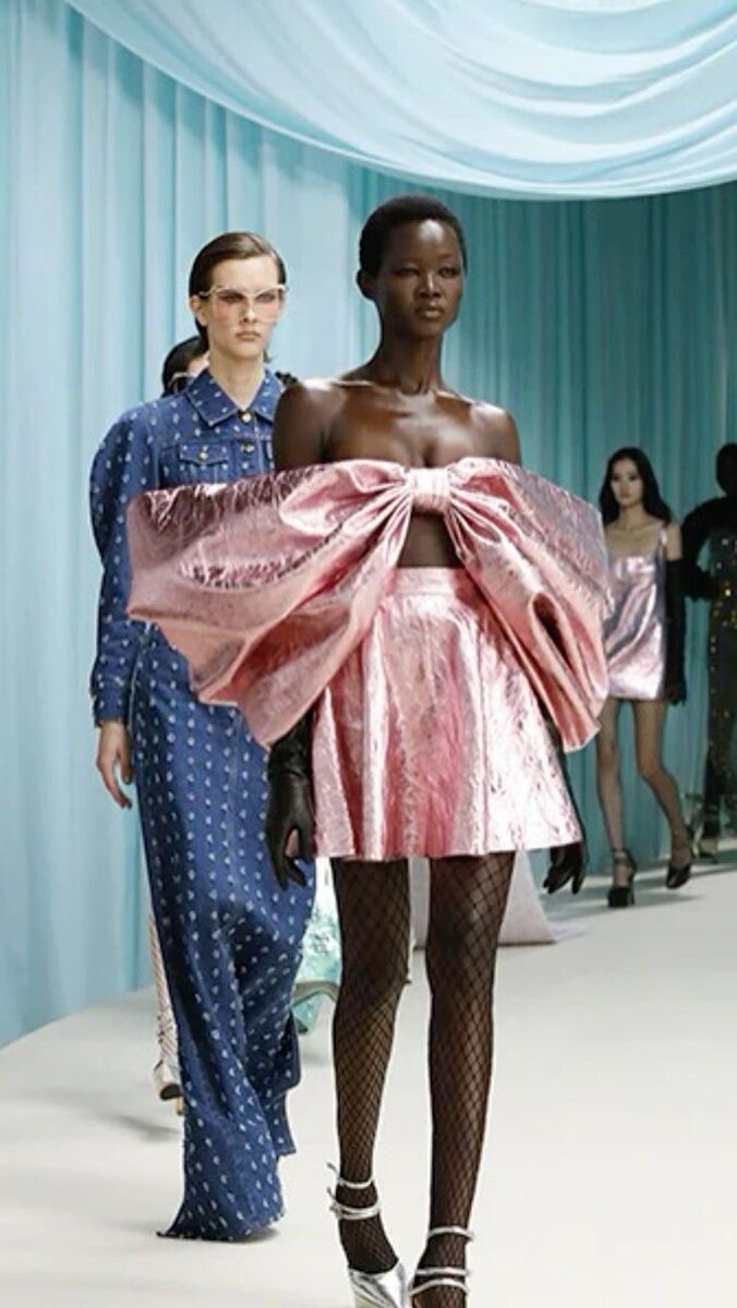 Иногда хочется женственный образ, особенно весной, когда всё начинает расцветать. Стилисты стали добавлять в наряды банты разных цветов и размеров повсюду, делав аутфит необычным и нежным. Главный атрибут школьных лет теперь будет не только на голове, но и на одежде, и даже ногтях (весенний маникюр никто не отменял). Наверное, не все любили в детстве банты, но может быть полюбите их уже в осознанном возрасте, кто знает!? Давайте скорее окунемся в мир красоты и посмотрим, что нам подготовила мода на этот раз. Тренд бантов уже несколько сезонов, но именно на весну-лето показы модных дизайнеров пестрили бантиками разных размеров и в разных количествах. Такой брэнд как Nina Ricci продемонстрировали модель в топе с огромным бантом. Это, конечно, достаточно экстравагантный образ и на повседневную одежду не тянет, но вкусы у всех разные, поэтому на какое-либо торжество будет кстати. Этим дизайнеры хотели показать, что такого элемента одежды должно быть достаточно много. Ещё один брэнд вообще