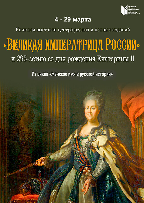 Императрица Екатерина Великая В читальном зале центра редких и ценных изданий открылась книжная выставка, посвященная 295-летию со дня рождения русской императрицы Екатерины II, из цикла «Женское имя в русской истории». С именем императрицы Екатерины Великой, правившей страной более 30 лет, связана вся история России второй половины XVIII века. Она была одним из самых сильных, влиятельных и успешных монархов Европы своего времени. Период ее правления назван «золотым веком» Российской империи – временем масштабных реформ и крупных военных побед. Императрица сумела существенно расширить границы России, присоединив Крым, Причерноморье и восточную часть Речи Посполитой. При ней было образовано 29 губерний и основано 144 города. В период правления Екатерины II, в России на государственном уровне получают поддержку – наука, образование, литература, искусство и теа