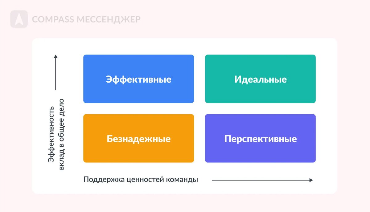 Если вы ответили «да» на каждый вопрос, то вписываете имя сотрудника в верхнюю правую ячейку. Таких специалистов мы назвали идеальными. Под ними находятся перспективные сотрудники — это люди, которые разделяют ценности команды, но пока вносят не слишком большой вклад в общее дело.