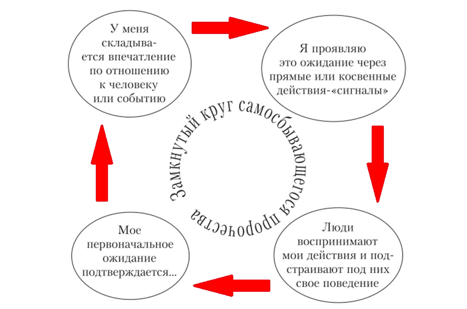 Наши негативные ожидания относительно себя или других людей влияют на наше поведение таким образом, что сами приводят к реализации этих ожиданий. Другими словами, если мы думаем о себе или о ком-то плохо, то это негативное мышление может привести к негативному поведению, которое мы даже не осознаем. И в итоге это поведение приводит к негативному результату, который кажется случившимся сам по себе. Например, если человек убежден, что не сможет достичь определенной цели, то он может просто перестать работать над ее достижением, и его предсказание сбудется. Представьте ситуацию, когда человек хочет начать собственный бизнес, но считает, что у него нет необходимых навыков и опыта для этого. Он убежден, что не сможет успешно реализовать свою идею и достичь финансового успеха. Из-за этого убеждения он даже не пытается начать работу над своим бизнесом, откладывает свои планы на потом или вообще отказывается от них.