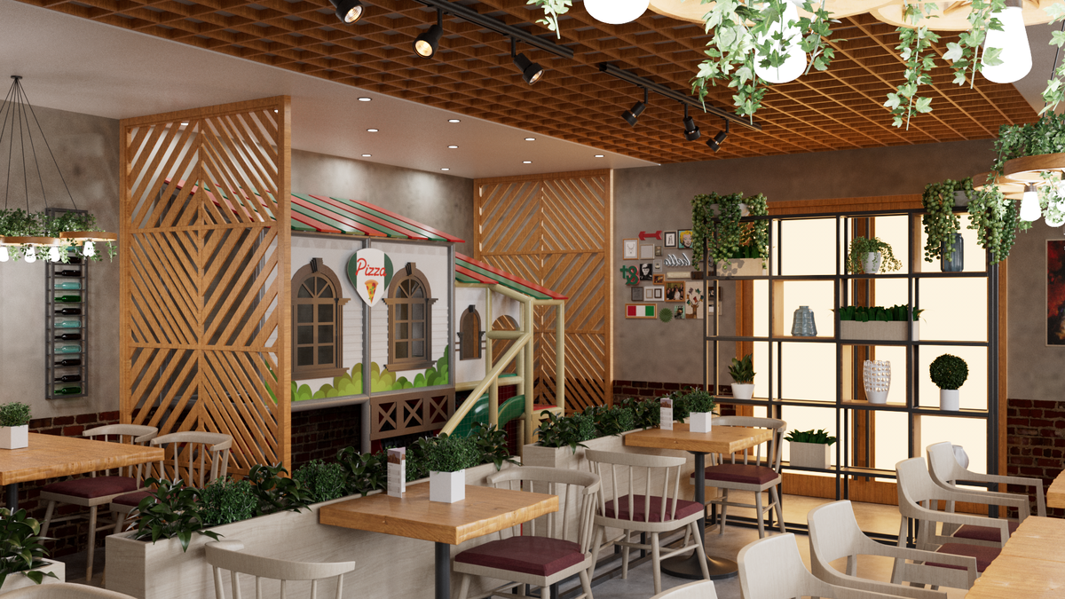 К нам обратился семейный итальянский ресторан со спокойным интерьером и мы разработали дизайн-проект игровой. небольшое игровое пространство занял детский игровой лабиринт с сухим бассейном, горкой и препятствиями. Игровая просматривается родителями и идеально подходит под интерьер.